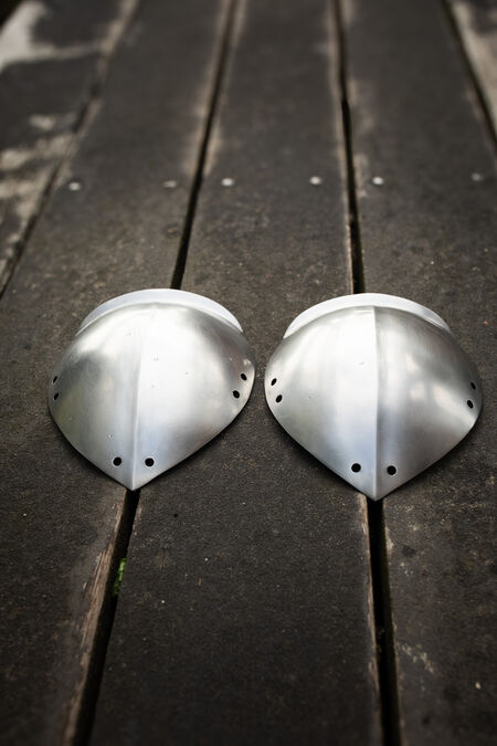 Genouillères et cubitières en acier trempé teinté et en forme de cône – nous avons présenté tant de défenses ces derniers temps que nous avons dû créer une sous-catégorie à part pour elles ! Magnifique chapeau en velours et version en acier trempé de nos gantelets populaires « Garde du Roi ».