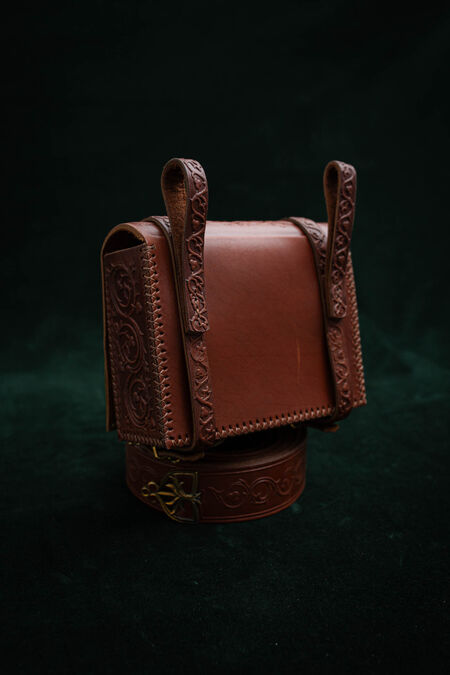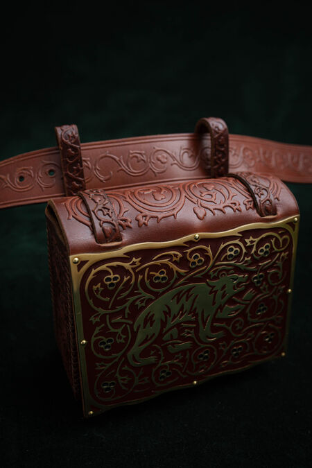 Bienvenue au nouvel accessoire ! Il est là pour apporter de la joie et un sentiment de « Enfin ! » à tous ceux qui aiment avoir des ours sur leurs vêtements ou leurs accessoires. Le voici, l'ours féroce, gravé dans le laiton et décoré d'émail. Autour de la bête, tant sur la plaque de laiton que sur le cuir lui-même, des motifs floraux sont magnifiquement disposés. Ce sac médiéval est bien plus sophistiqué et chic que la pochette moyenne et conviendra parfaitement à un personnage noble ou à un chevalier.
