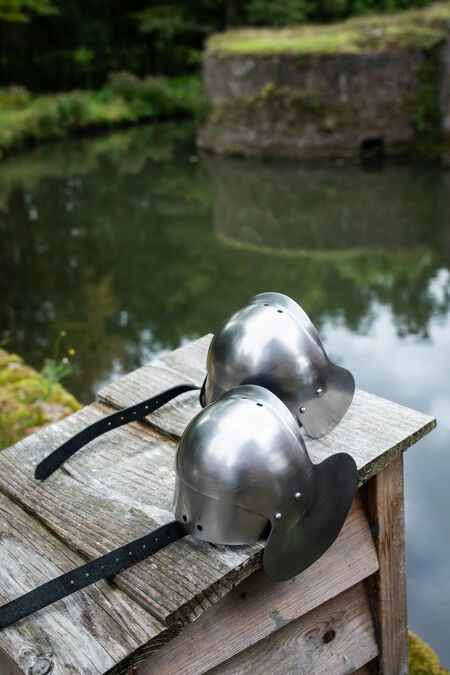 Cet ensemble, ainsi que son homologue « Mercenaire », est une armure pratique axée sur le maniement de l'épée, conçue pour créer un ensemble d'armure esthétique, fonctionnel et relativement peu coûteux. Il peut servir de base pour les armures lourdes de type SCA ou HEMA harnischfechten, ainsi que pour d'autres applications WMA. Ces armes constituent donc l'option simple et parfaitement fonctionnelle que nous proposons pour l'ensemble d'armure occidentale. Les protège-bras de base avec coudières lacées représentent une solution éprouvée depuis des siècles.