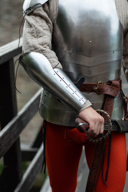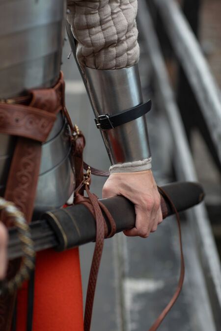 Cependant, les bazubands sont largement considérés comme un équipement fonctionnel et simple d'utilisation pour l'armure lourde SCA, le combat à l'épée live steel, etc. Nous avons donc jugé cette option pertinente. Cet ensemble, tout comme son frère « Mercenaire », a été conçu dans l'optique de créer un kit d'armure simple et fonctionnel pouvant servir de base à l'armure lourde SCA, au combat à l'épée livesteel WMA ou aux Harnischfechten AMHE.