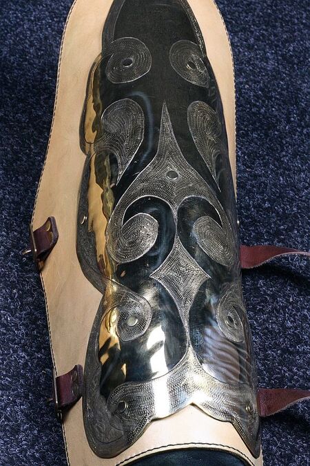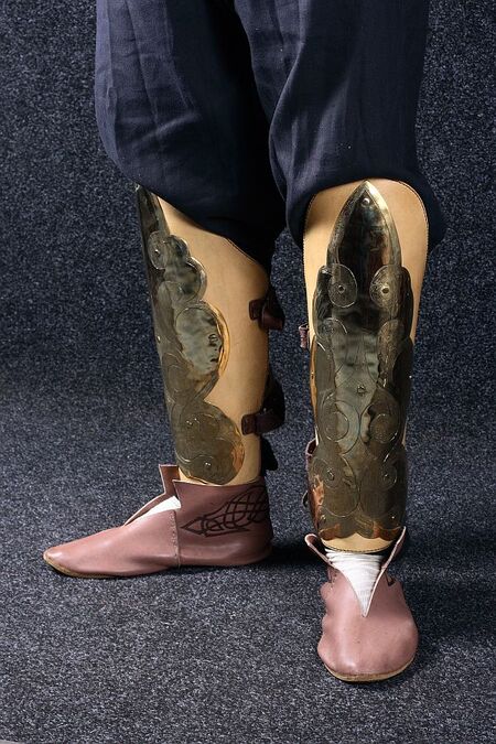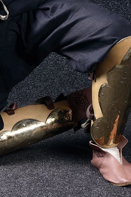 Great fantasy greaves. Multilayered combat leather greaves with amazing quality handmade brass plates.