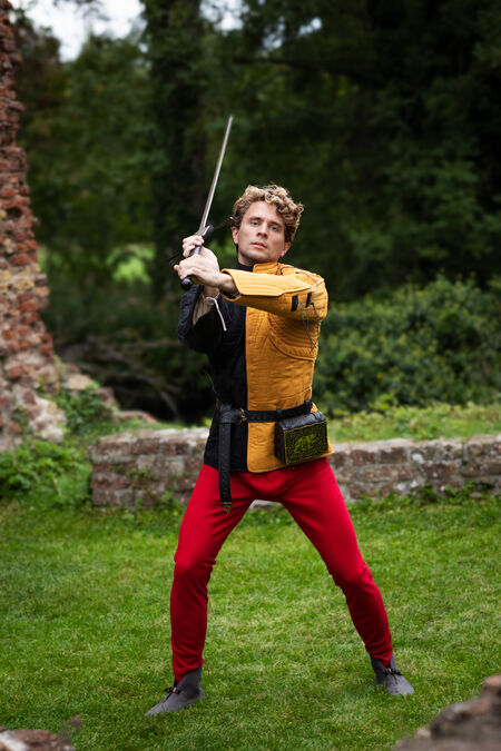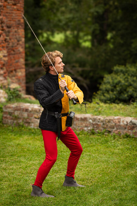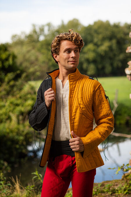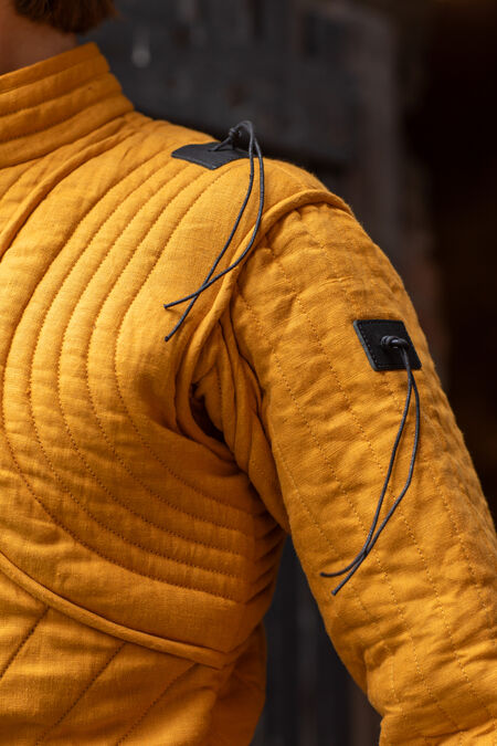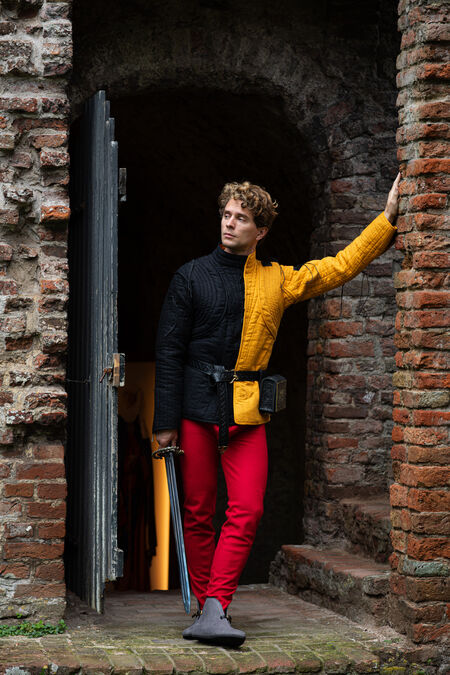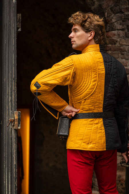 La disposition bicolore typique du Moyen Âge permet d'afficher ses préférences de couleurs, celles de sa maison, de son clan ou de son équipe sans dire un mot. Le gambison comporte également des points d'attache en cuir pour les pièces d'armure aux épaules et aux manches. Une longue fente sur la manche permet de l'ajuster parfaitement au bras lorsqu'on enfile un brassard métallique près du corps.