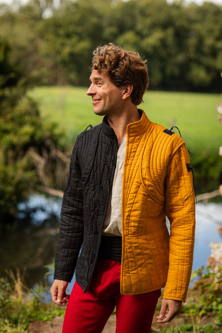 C'est une pièce confortable et élégante qui allie les avantages d'une coupe moderne et pointue à une esthétique résolument médiévale. Cette veste courte et cintrée présente un matelassage anatomique raffiné qui dessine une silhouette en sablier saisissante, aux lignes quasi architecturales. La manche en deux parties et le large gousset offrent une liberté de mouvement optimale, garantissant ainsi une grande liberté de mouvement. Le gambison se ferme par des lacets et des passants discrètement dissimulés dans le rabat avant.