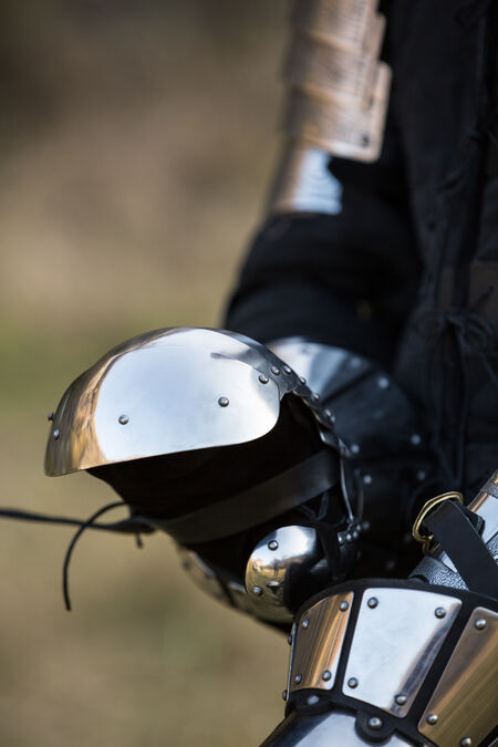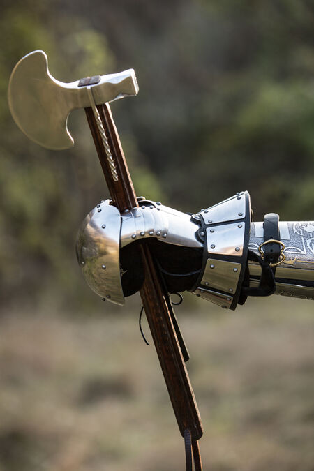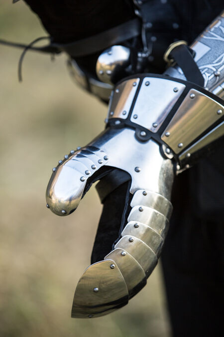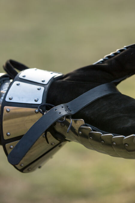 Les gantelets intérieurs en cuir sont inclus et rivetés au-dessus des doigts et du pouce au gantelet métallique ainsi vos doigts ne risquent pas de se déplacer hors le gantelet lamellaire. Ce type d’articulation empêche les gants intérieurs en cuir de remonter et de se déformer lors des entraînements intenses ou dans le feu d’un combat. La longueur du gant intérieur est ajustée pour convenir à la longueur des gantelets – plus de chevauchement incommode avec votre défense des bras.