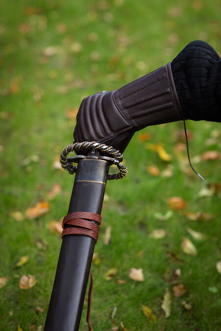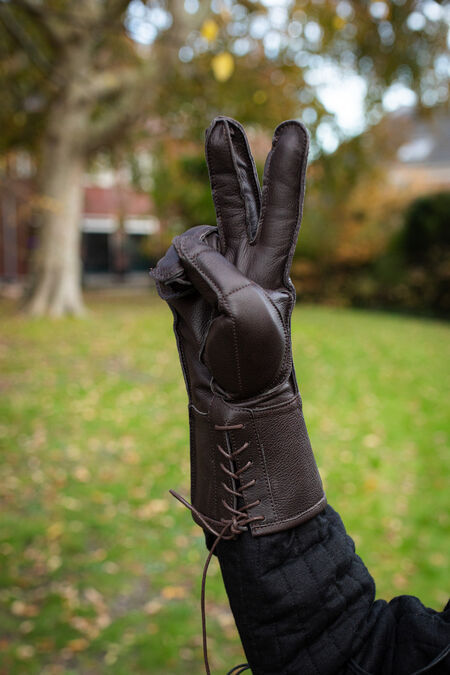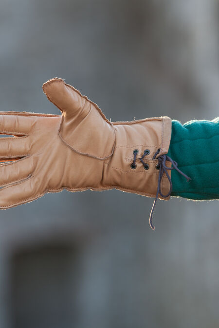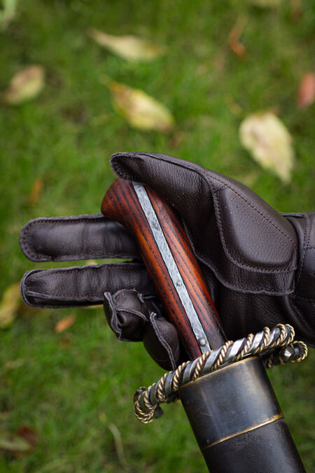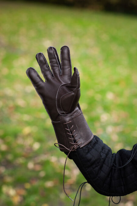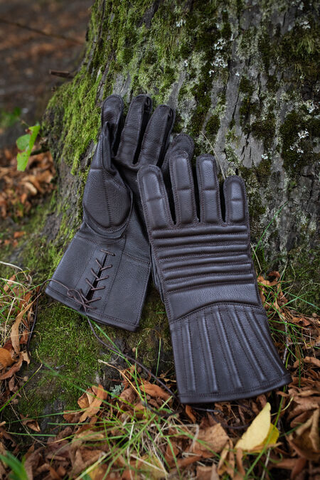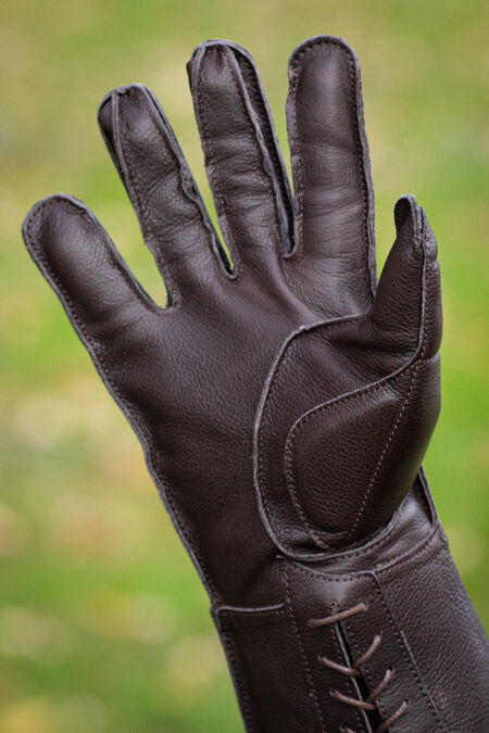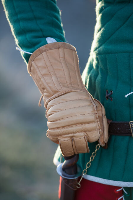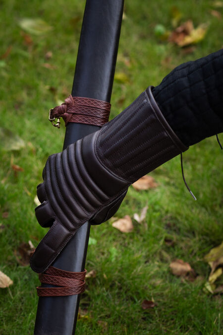 Les doigts articulés et les propriétés tactiles de cuir assurent une prise parfaite et la flexibilité maximale. Vous pouvez les porter en vous servant d’épée ou de hache. Les gants sont confectionnés de cuir véritable et rembourrés de ouatinage en mousse isolant (5 mm d'épaisseur). Les manchettes plutôt longues protègent les poignets.