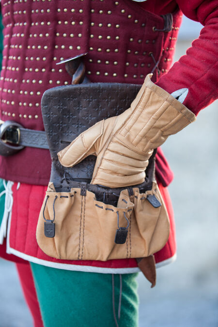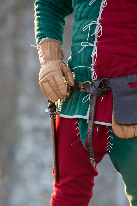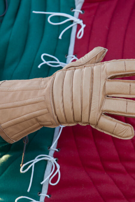 Évidemment, le gambison était un élément de rembourrage de première importance pour un combattant à l'époque – mais bien sûr pas le seul. Les gants jouaient un grand rôle : au début c'étaient des mitaines rembourrées encombrantes et gênantes. Mais avec le développement des armures les gants ont beaucoup évolué eux aussi, s'étant transformés en des gants bien ajustés à lacets.