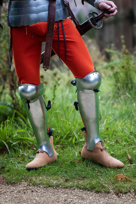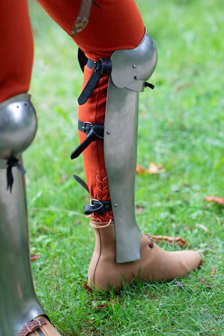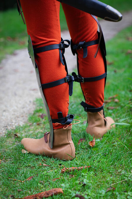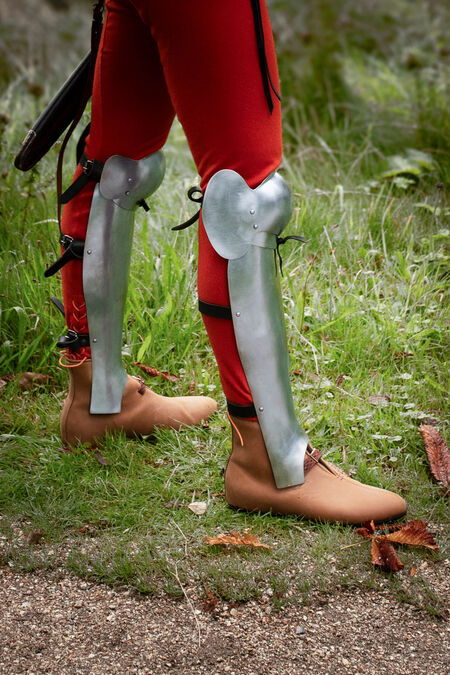Le design de ces grèves est assez simple : une cnémide avant et des genouillères lacées offrent une protection de base. Si vous souhaitez des cuissards, vous pouvez les commander séparément. Pour vous inspirer, consultez les Jambières médiévales Rieneck.