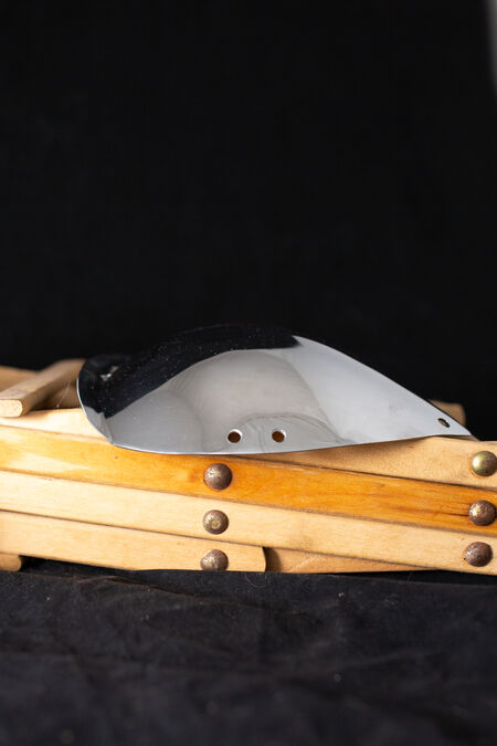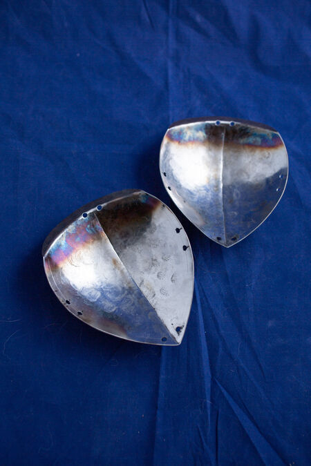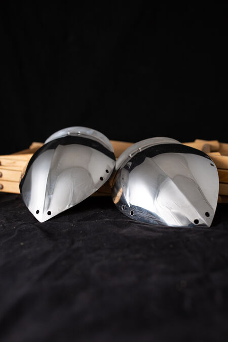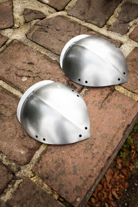 Ces spallières sont le modèle le plus simple de notre gamme. Simples et dotées d'œillets de laçage sur tout le pourtour pour les fixer à un gambison ou une veste d'AMHE, elles sont fabriquées en acier à ressort trempé, ce qui les rend particulièrement légères et confortables. Après quelques combats d'essai, vous ne les remarquerez probablement même plus. Découvrez ici la version noircie (ou dorée au laiton).