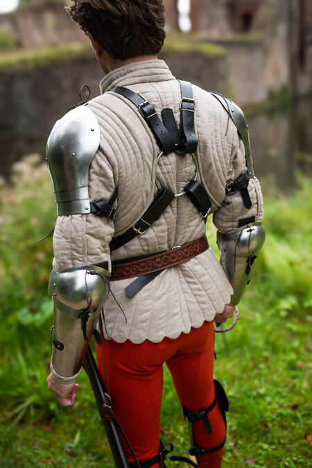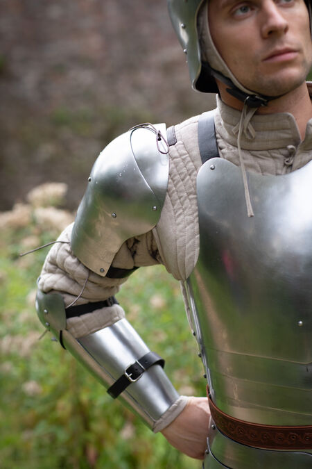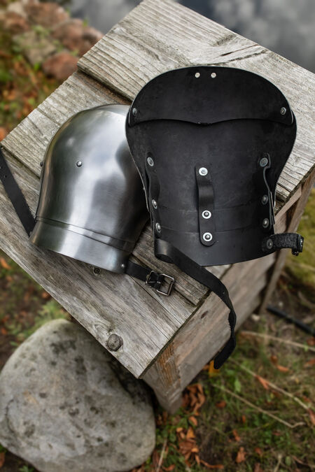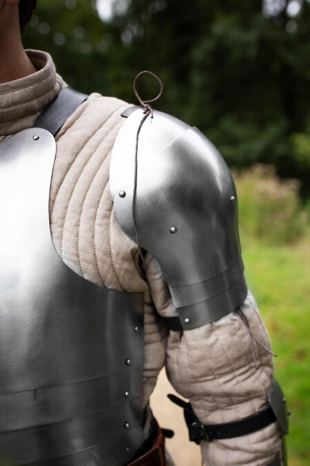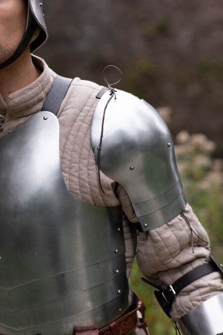 Ce modèle simple mais éprouvé offre une bonne protection des épaules, couvrant largement la zone d'une armure de base. Sa conception segmentée et son faible poids rendent ces épaulières parfaites pour pratiquement toutes les armes et situations de combat à l'épée, des compétitions SCA lourdes aux combats HEMA harnischfechten en passant par les tournois d'armes blanches et les GN.