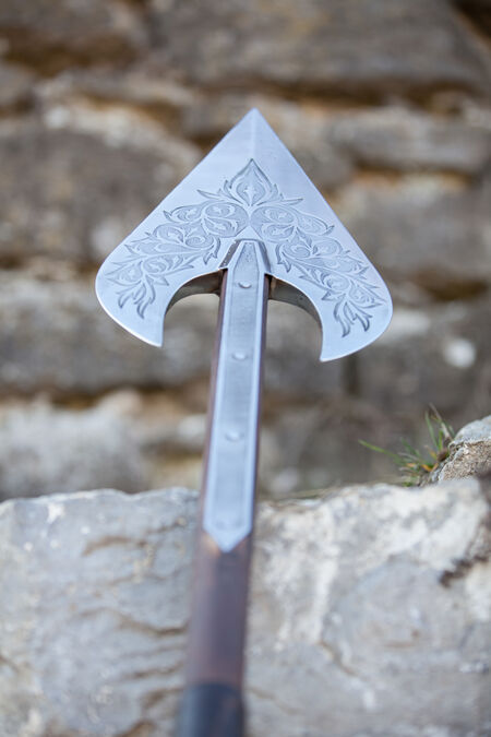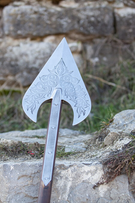 La tête de la hallebarde est ornée d'un motif floral gravé raffiné, assorti aux autres armes de la collection « Chien de Guerre ».