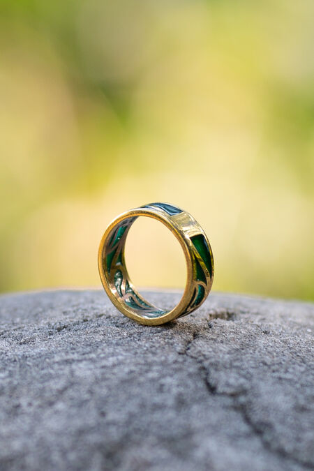 La forme de l’anneau est assez simple mais qui est rendue admirable grâce aux lignes artistiques du motif elfique en feuilles. Ces découpes sont ensuite remplies d’émail contrastant manuellement par nos bijoutiers.