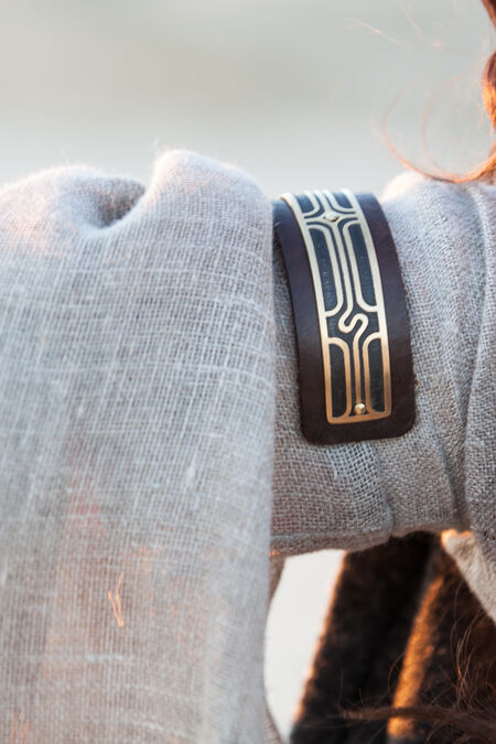 Ce brassard semi-flexible se fabrique d'un cuir épais et il est décoré d'une plaque en laiton. Son design souligne la beauté de la simplicité géométrique, l'effet patine valorisant de plus la pureté des lignes. Le brassard peut être porté sur le biceps, comme initialement conçu, ou sur l'avant-bras. Comme le brassard est entièrement ajustable, il n'y a pas de fermeture : cela reste ou il est mis. C'est simple et élégant, vous pouvez le porter tout seul ou suppléer l'ensemble avec d'autres bracelets de votre collection personnelle.