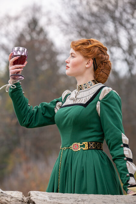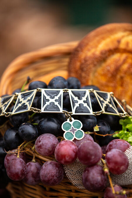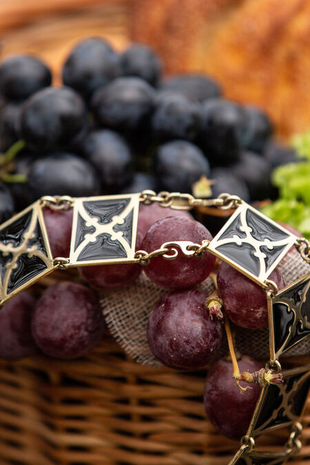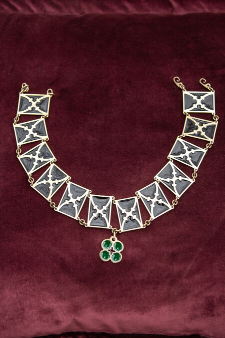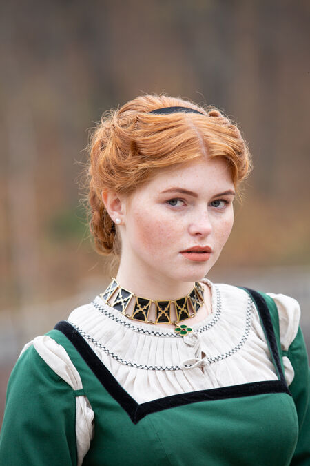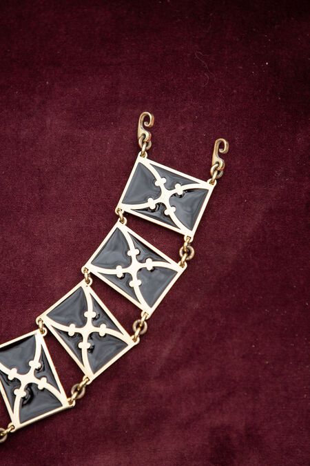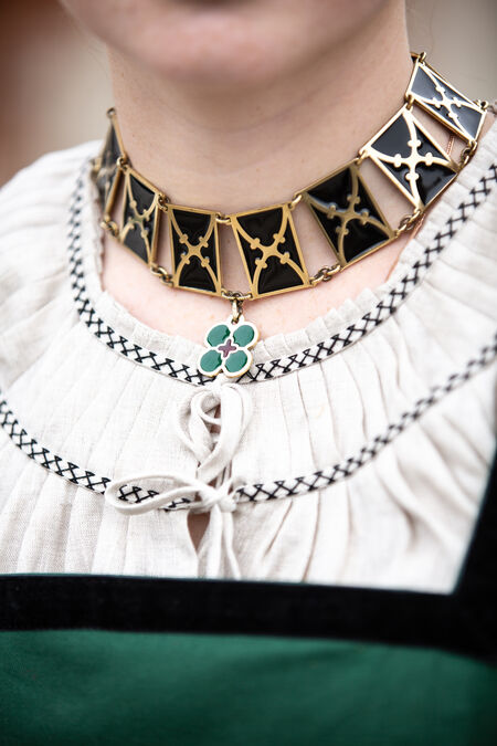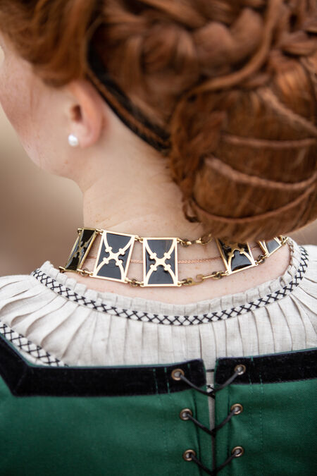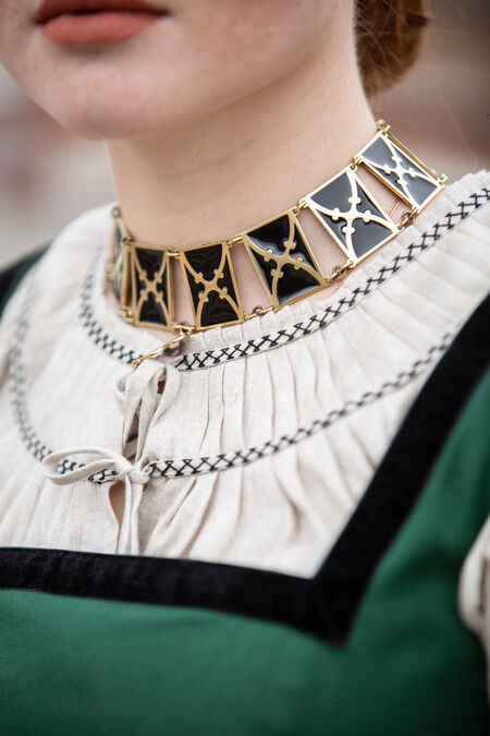 Le collier est assez ajusté, il enlace le cou de manière qui est assez serré mais sans être inconfortable. Il se compose d’un nombre de rectangles de laiton conçus par nos artistes-designers après avoir étudié les motifs du XVIe siècle. Placés à côté l’un de l’autre ils rappellent une série de vitraux sur une église. Bien que ce collier ras du cou ne soit pas proprement historique nous avons fait des efforts pour créer un bijou qui aurait pu exister et convienne à l’esthétique de l’époque. Le laiton a été découpé au laser pour fournir à chaque pièce une forme idéale et puis remplie d’émail pour assurer un contraste ravissant des matériaux. Les carreaux sont entreliés par les anneaux en laiton qui les tiennent ensemble correctement.