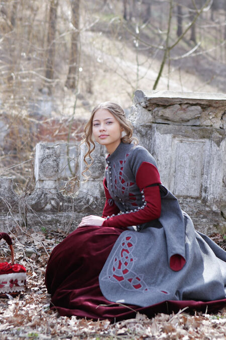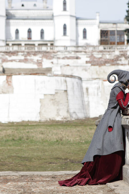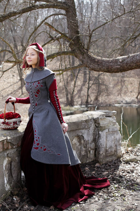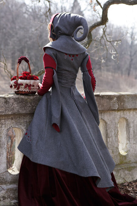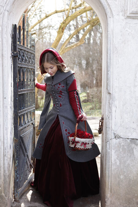 Le manteau cintré en laine a une silhuette descendant : à l'avant sa longueur atteint le niveau de genou tandis qu'à l'arrière il descend presque jusqu'à la cheville. Le manteau est serré à la poitrine et à la taille, mais s'élargit rapidement au niveau des hanches. Sa silhouette se réfère simultanément à deux prototypes historiques - robes gothiques de la fin du Moyen Age et des jupes bouffantes du baroque. Le thème médiéval peut être retracé dans l'ajustement serré du corsage avec une taille basse, dans les manches longues fausses fabuleusement étroites, dans le rebord contrastant en forme de feuille sur la manche court, dans le petit boutonnage métallique gravé avec les boutonnières et dans le stylistique de la broderie et le motif d'applique. Dans le même temps, la jupe froncée au niveau des hanches s'associe avec les robes de contes de fées illustrés - qui est baroque ou même rococo. En plus les deux proéminences et la richesse du modèle est typique pour les costumes de la période ultérieure.
