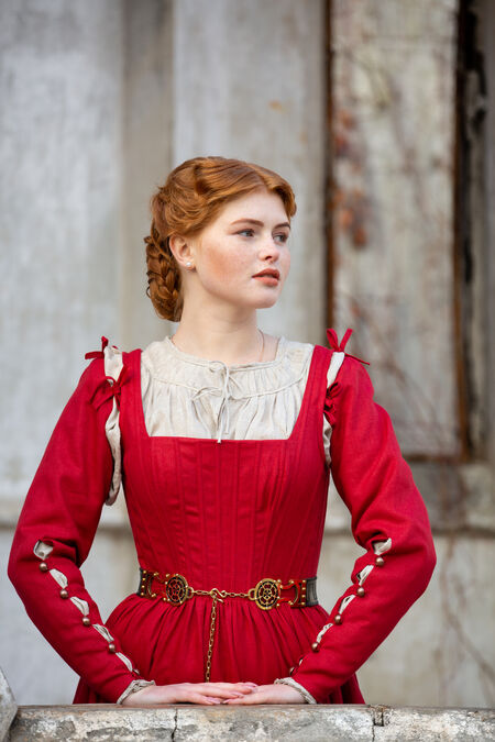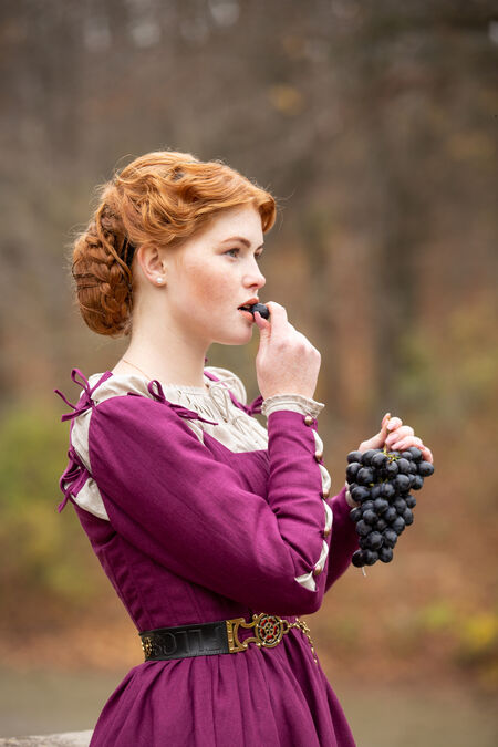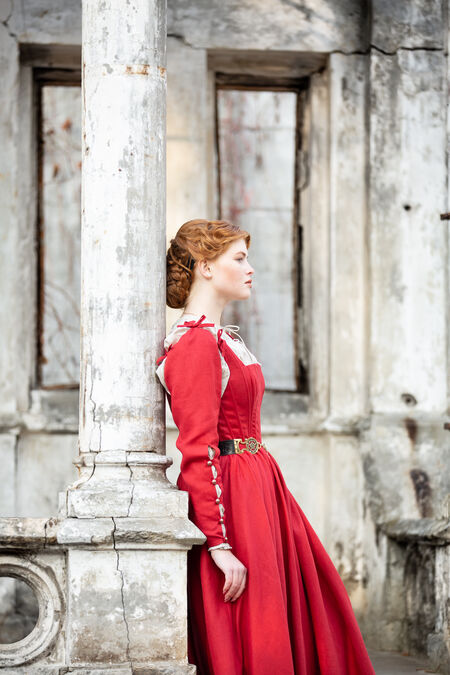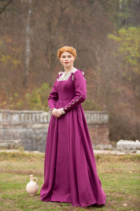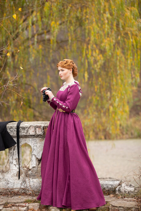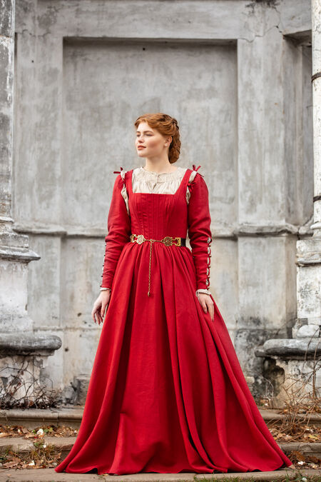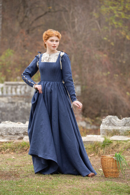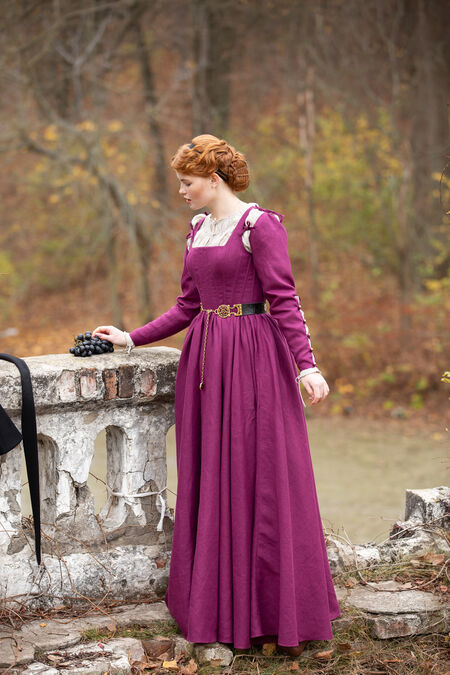 Cette robe a été largement inspirée par le 16e siècle notamment par les tableaux de Woensam. Nous avons constaté l’évolution des tenues basiques de XIV-XV s., elles sont devenues plus structurées avec une ligne de taille plus remontée. Ce type de vêtements seraient portés par une femme de milieu supérieur puisqu’il est difficile de serrer le laçage sur le dos soi-même alors elle a dû avoir une servante ou une domestique. La base de la robe est pourtant luxueusement simple en vous laissant beaucoup d’espace que vous êtes libre de personnaliser à la manière qui convient le mieux à votre personnage. Et qui sait – peut-être votre personnage de paysanne sera assez habile pour serrer elle-même le laçage de dos !