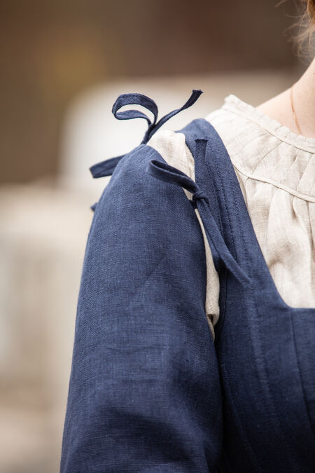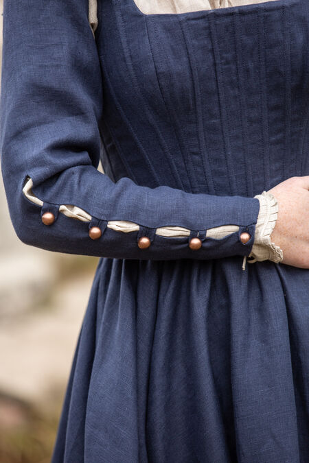 Le lin naturel n’a pas été utilisé traditionnellement pour ce type de robe (c’était plus probablement de la laine) mais nous aimons bien créer des choses qui sont confortables pour nos clients qui vivent dans les temps modernes ! Le lin a un tissage magnifique qui lui permet d’être bien respirable, ainsi ce tissu convient à toutes les conditions climatiques. Les œillets sur le dos sont faits en métal de sorte que vous puissiez serre la robe bien fort sans craindre d’endommager la robe.