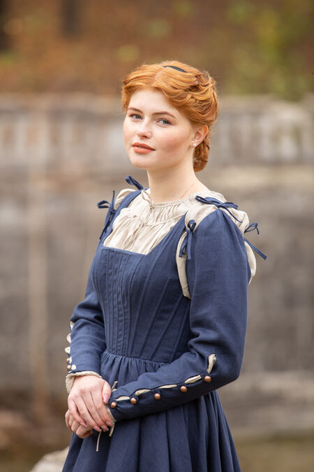 Traditionnellement cette robe se portait avec une chemise puisque le buste est assez ouvert. L’encolure carrée et le corsage à baleines se complètent pour mettre en valeur la taille fine et le buste haut qui sont surtout séduisants à côté de la jupe ample qui tombent jusqu’au sol. Les manches sont ajustées au poignet d’une manière très élégante et les boutons créent un contraste à côté du tissu de la robe et de la chemise ou autre sous-vêtement. Comme les manches sont détachables c’est à vous de choisir de porter votre kirtle avec ou sans manches.