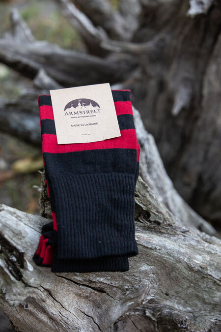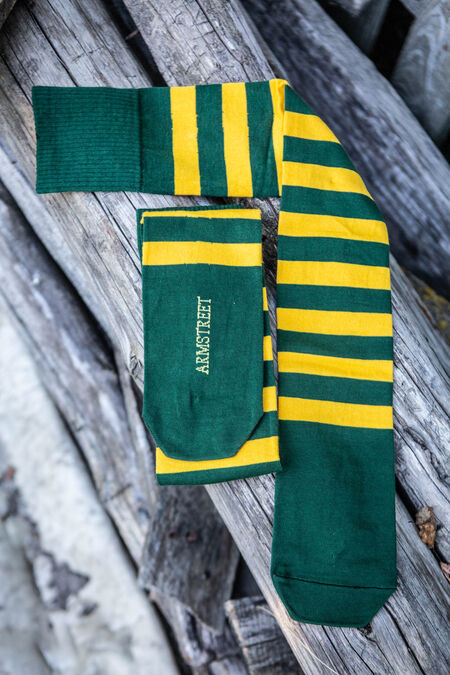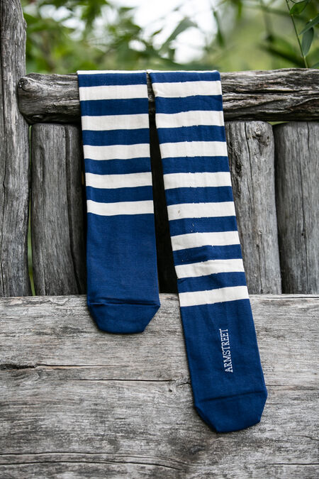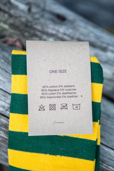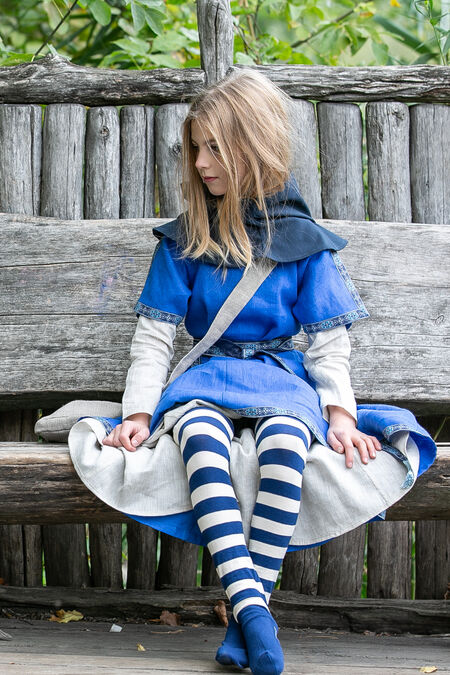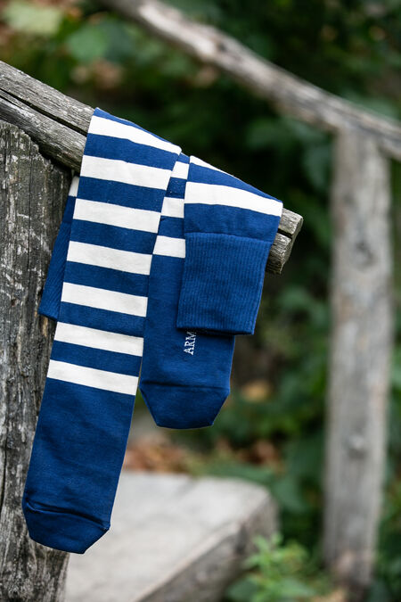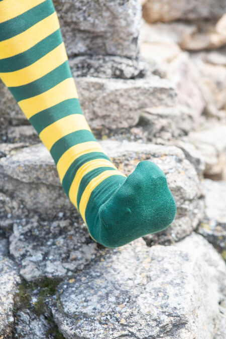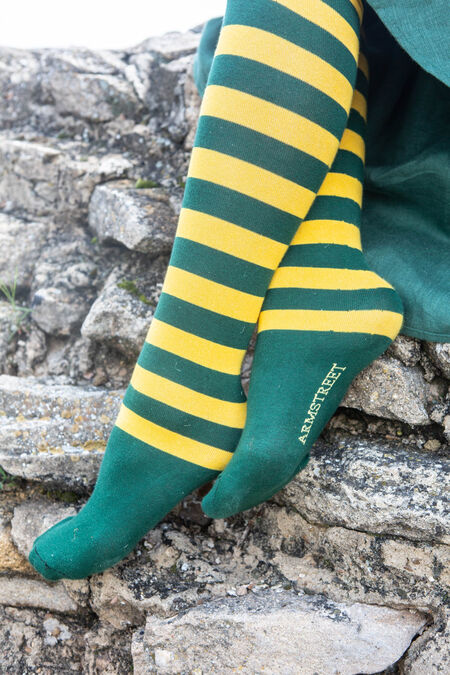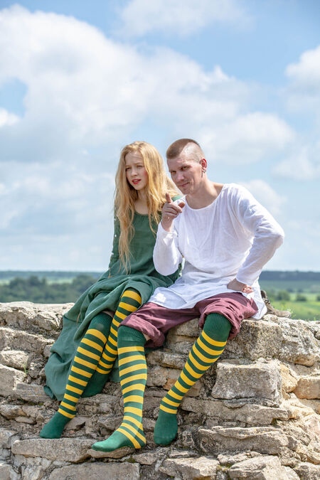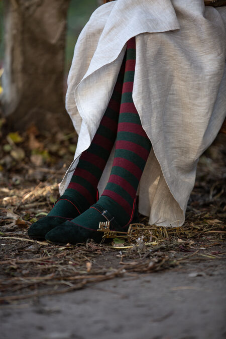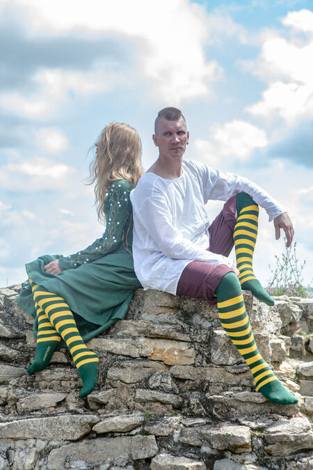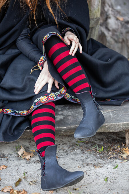 Ces jolies chaussettes sont à la hauteur des genoux et vont garder vos jambes bien au chaud aussi. Elles sont assez épaisses et ont une texture très agréable qui ira bien à toute tenue médiévale. Elles sont rayées en direction horizontale en alternant les couleurs et sont faites en coton 95% et élasthanne 5% qui les rend confortables et un peu plus élastiques.