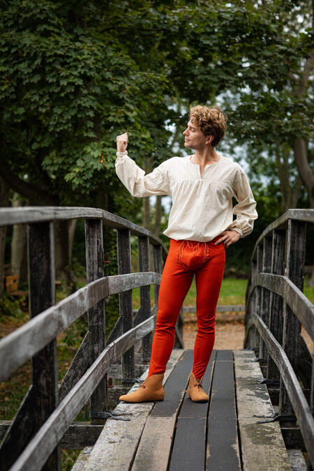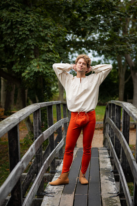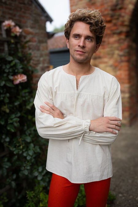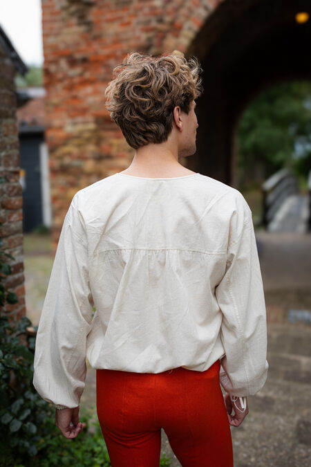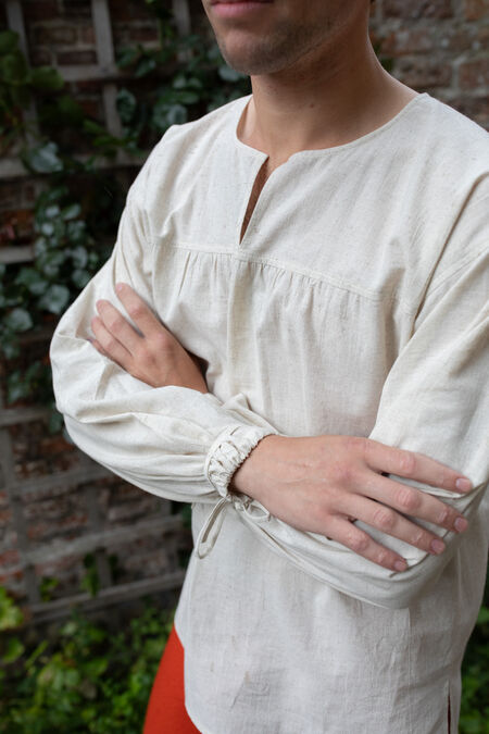 Cette chemise est une pièce de transition à bien des égards. Elle représente une évolution entre les tuniques en vogue à la fin du Moyen Âge et le style masculin du début de la Renaissance. Confectionnée en popeline 100 % lin et coton mélangés (40 % de lin pour une respirabilité et une régulation thermique optimales, et 60 % de popeline de coton, couramment utilisée pour les chemises, pour un tombé fluide et élégant), elle offre un aspect souple et harmonieux.