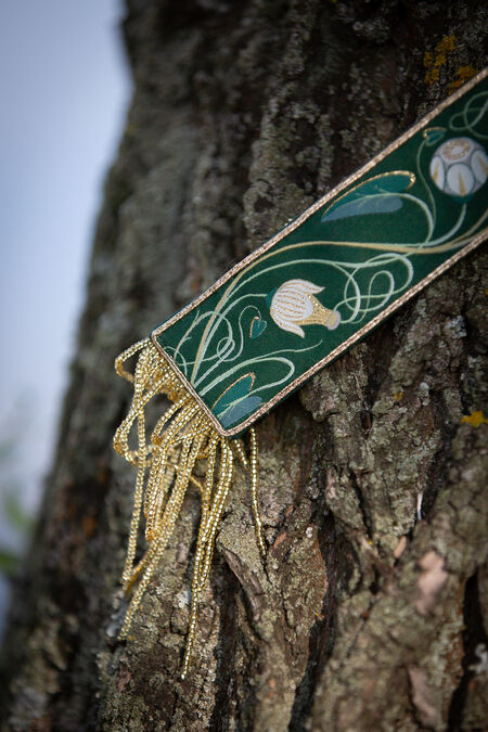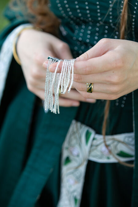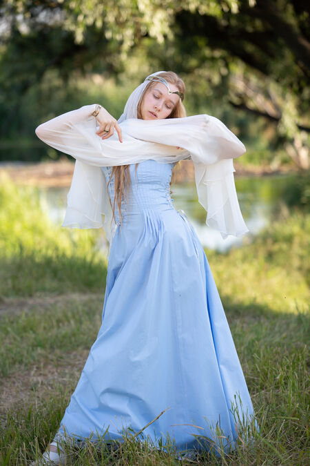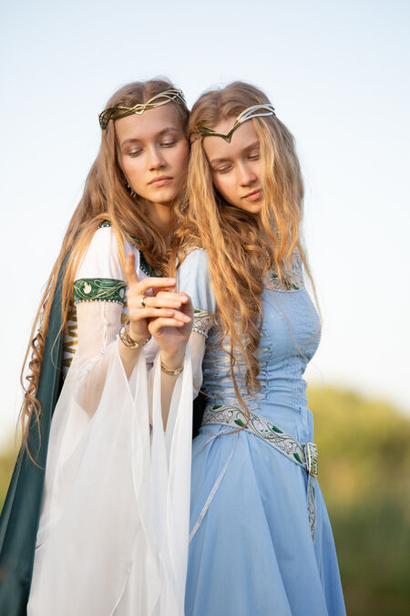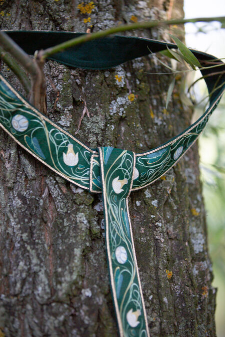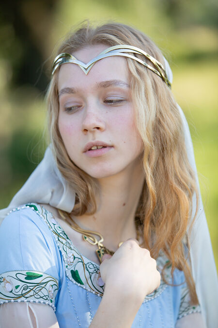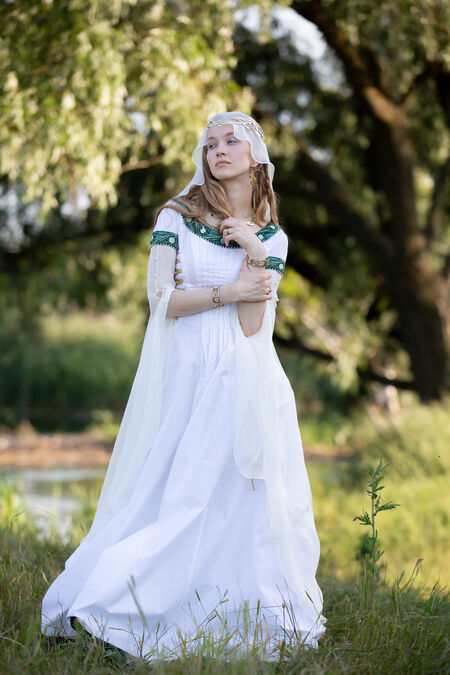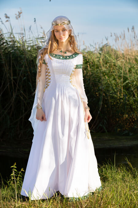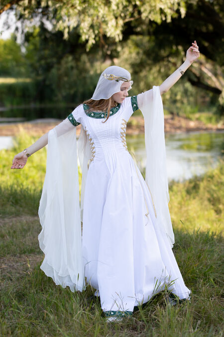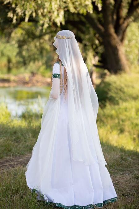Chaque élément de nos costumes médiévaux est confectionné avec soin et une grande attention aux détails pour sublimer l'occasion spéciale où il est destiné à briller. Loin des costumes de reconstitution historique classiques choisis pour leur aspect pratique, ce sont de véritables trésors, ornés de mille feux. Inspirés par les nénuphars et les motifs Art nouveau, les passements réalisés sur mesure décorent l'encolure, l'ourlet, la ceinture et les manches. Les plis du corsage scintillent de perles, et les manches en chiffon de soie brillent doucement comme un clair de lune. Ce même éclat subtil se retrouve dans le voile de soie fluide, qui parachève l'ensemble d'une touche de légèreté et de féerie. Le voile est de taille unique et mesure 1,5 m de diamètre.