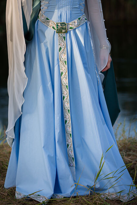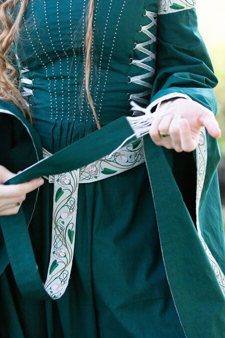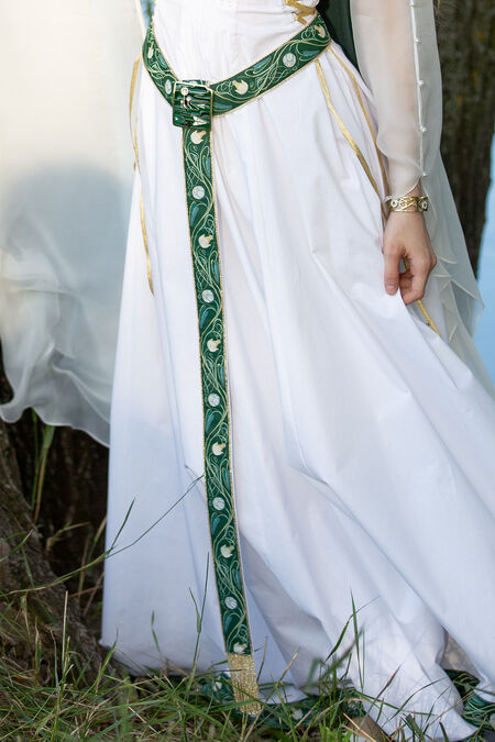 Au cœur de cet ensemble se trouve une robe de mariée féérique, rayonnant d'élégance et de charme. Son large décolleté, typique des vêtements féminins de la Renaissance, est orné de fausses perles et de motifs délicats, lui conférant à la fois pudeur et féerie. Le corsage ajusté, orné de plis et de perles, flatte toutes les silhouettes, tandis que le laçage latéral assure un maintien parfait. Les manches courtes et décoratives laissent place à de longues manches fluides en chiffon de soie naturelle, si légères qu'elles semblent flotter au moindre souffle de vent. La jupe, longue et ample, est composée de panneaux supplémentaires qui créent une silhouette gracieuse et fluide, avec un ourlet d'une longueur impressionnante de 8 à 9 mètres. Parfaite en elle-même, cette robe de mariée médiévale est sublimée par une ceinture en tissu. Celle-ci harmonise l'ensemble, ajoutant élégance et charme. Drapée jusqu'au sol, la ceinture apporte une touche de féérique et de fluidité à votre allure. Confectionnée en popeline de coton doux, cette ceinture est ornée d'un passement en soutache et d'une frange perlée de 9 cm. Sa forme parfaitement élaborée assure un ajustement impeccable à chaque fois, tandis que sa fermeture à bouton dissimulé lui confère l'allure d'une ceinture médiévale avec un confort moderne.