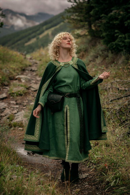 La tunique longue médiévale classique de coton 100% naturel bordée de magnifique passement a une fente à l'avant pour la marche facile.