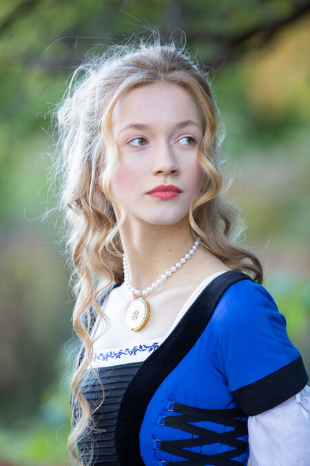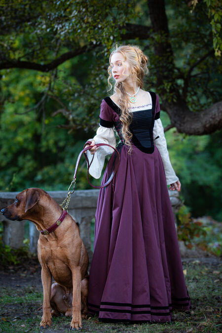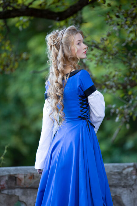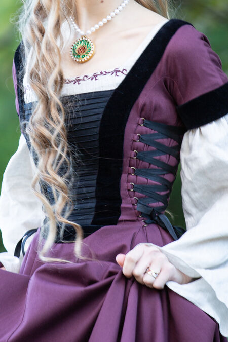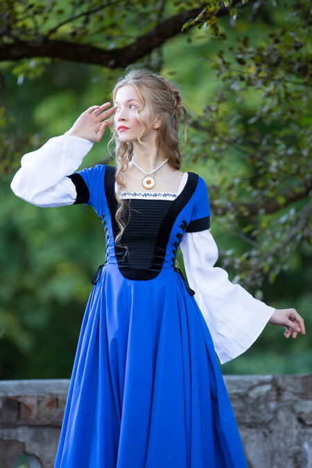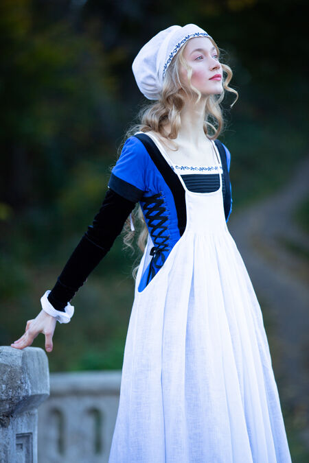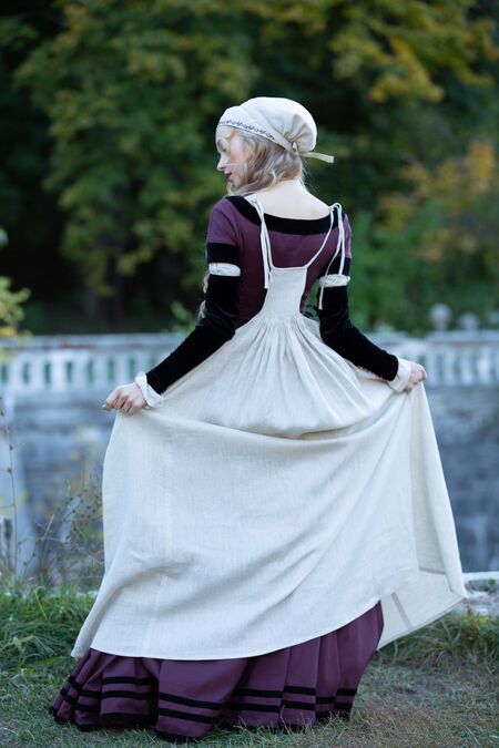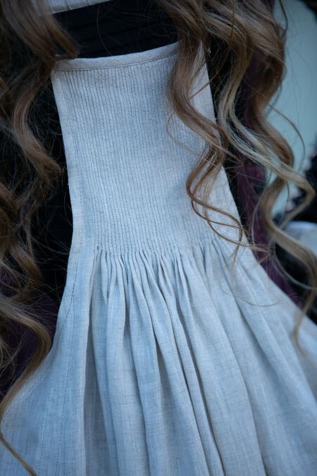 Ce tablier convient aux costumes Renaissance pour femmes incarnant différents rôles, tels que les fermières, les sages-femmes et les marchandes. Porté comme couche extérieure, il protège la robe des salissures et de l'usure sans la dissimuler entièrement : l'ourlet du bas, l'encolure et le laçage latéral de la partie centrale de cette tenue Renaissance restent visibles. Contrairement aux tabliers modernes, il couvre l'avant et l'arrière et possède des bretelles réglables pour un confort optimal. Ce tablier est vraiment volumineux – 1,5 mètre de tissu froncé en de minuscules plis de 2 mm sur la poitrine, donnant une ligne d’ourlet d’environ 4 mètres. Confectionné en lin fin, il est extrêmement pratique et n'entrave pas les mouvements.