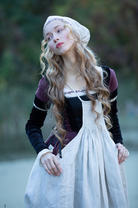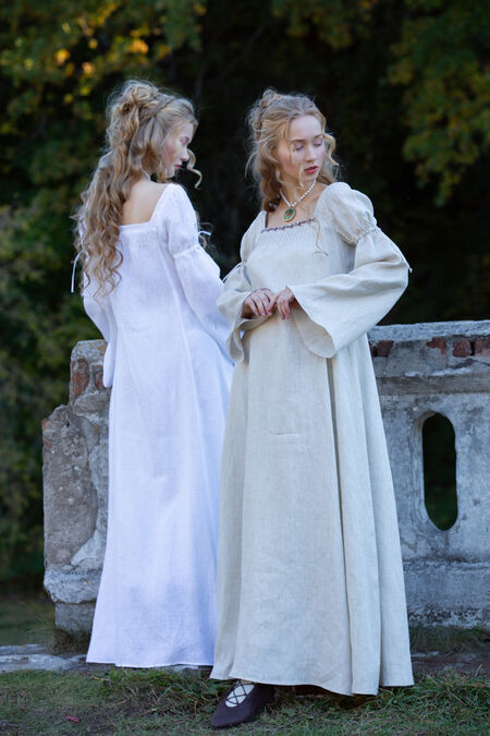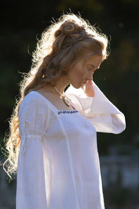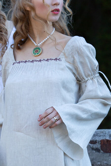 Ce type de chemise se portait traditionnellement sous la robe extérieure pour la protéger de l'usure et de la transpiration, tout en apportant volume et authenticité aux costumes de la Renaissance. Confectionnée en lin fin et doux, elle présente des manches cloche avec des cordons en lin, de petits plis aux épaules et une encolure carrée. Inspirée par la grâce et la beauté des vêtements des dames de la noblesse, elle est dotée de goussets supplémentaires pour créer une jupe volumineuse. Son délicat motif de feuillage brodé à la main le long de l'encolure ajoute une touche subtile et luxueuse.