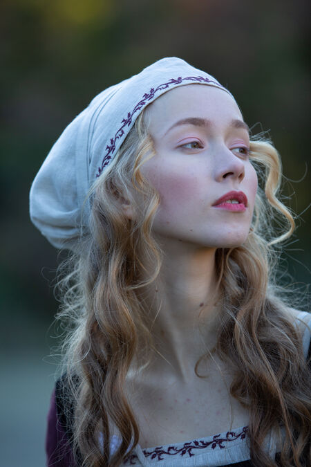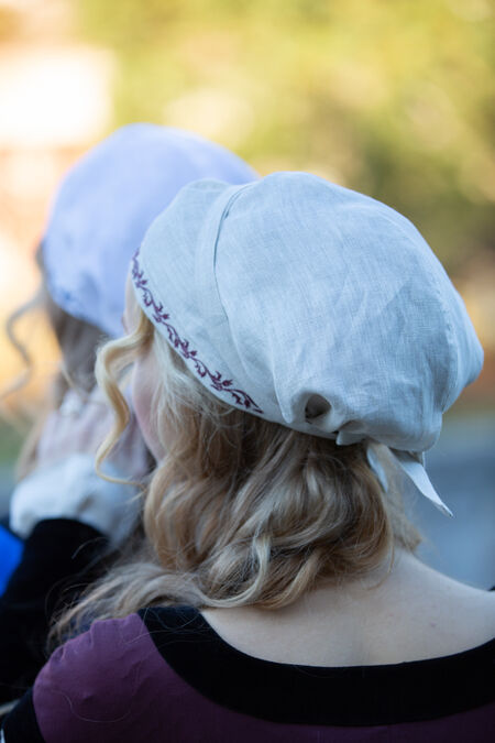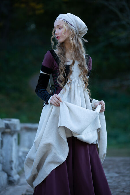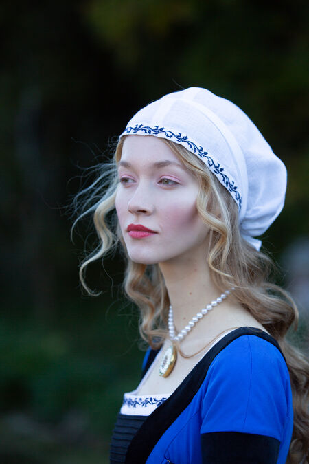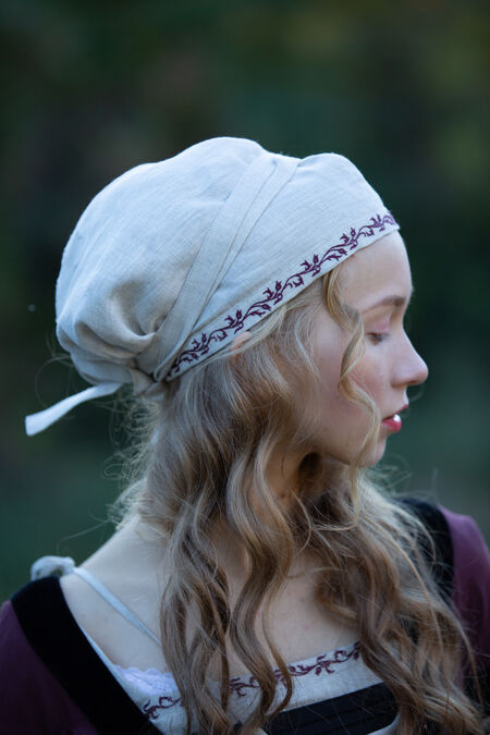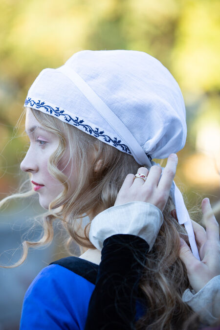 Cette coiffe d'inspiration historique est dérivée du bonnet Sainte Brigitte représenté dans la Bible de Maciejowski (XIIIe siècle). Confectionnée en lin fin, elle présente une couture centrale et un volume généreux à l'arrière. Ce couvre-chef peut accueillir tous les types de cheveux, quelle que soit la longueur de vos tresses, et les maintient en place grâce à deux longs cordons. Un magnifique ornement brodé à la main, le long de la ligne des cheveux, est assorti à celui de l'encolure de la chemise. Vous pouvez la porter seule ou sous un chapeau. Cette coiffe convient à divers personnages médiévaux, des paysans aux nobles.