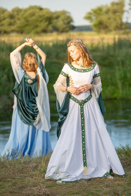 Vêtements médiévaux verts, en polyester, passement et velours, en promotion