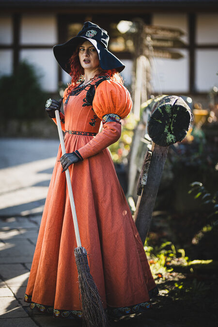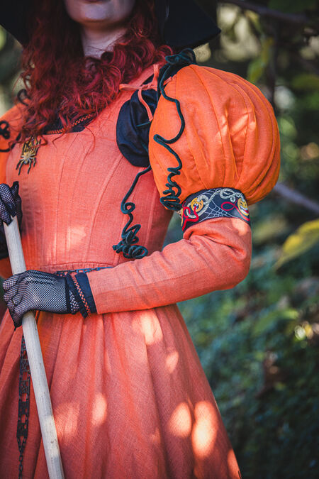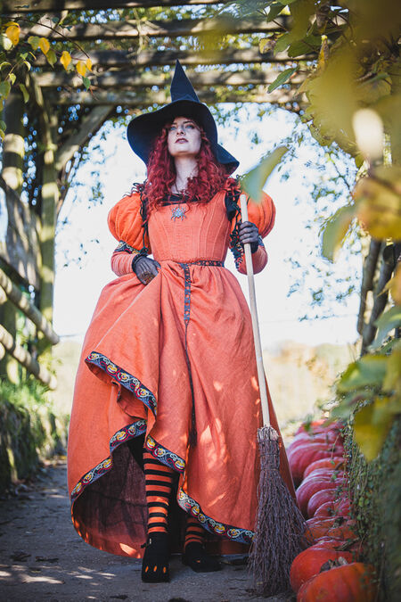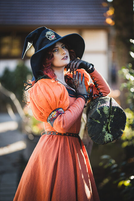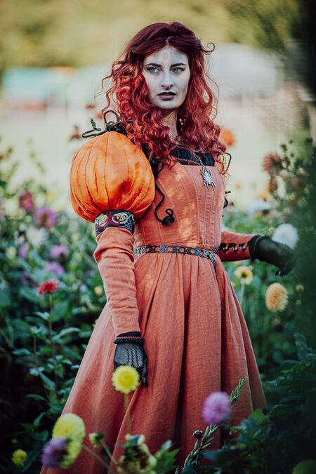 Cette ravissante robe de sorcière, pleine de gaieté, est ornée de manches bouffantes en forme de citrouilles. Ces chefs-d'œuvre d'architecture textile sont attachés à la robe baleinée de style kirtle par des lacets. Ceux du milieu, en velours, imitent la tige verte et sont renforcés par un fil de fer qui les maintient en spirale. Les deux autres lacets, en lin, sont assortis à la couleur de la robe et s'harmonisent parfaitement avec elle. La structure interne des citrouilles est le fruit de plusieurs semaines de réflexion au sein de notre département de développement, combinant divers matériaux et techniques, pour une tenue optimale.