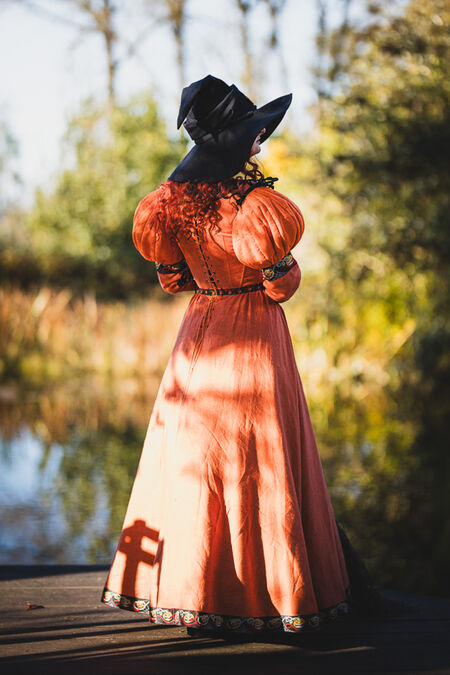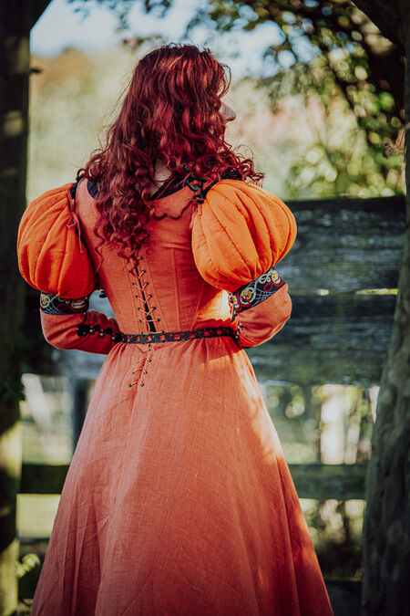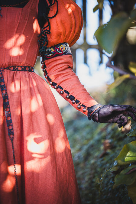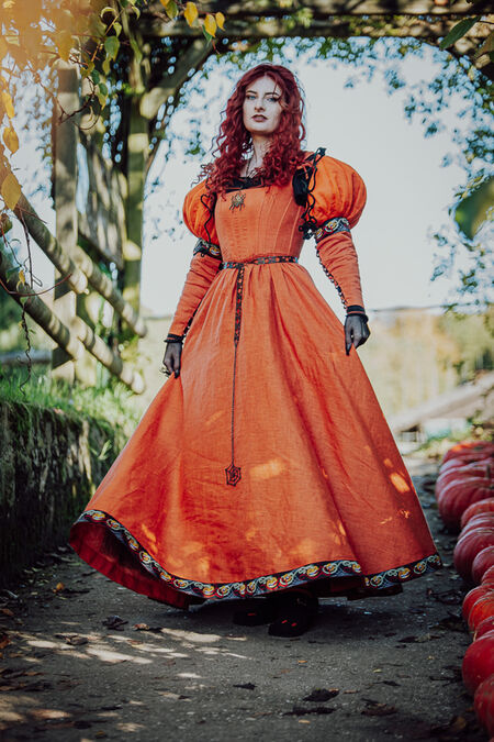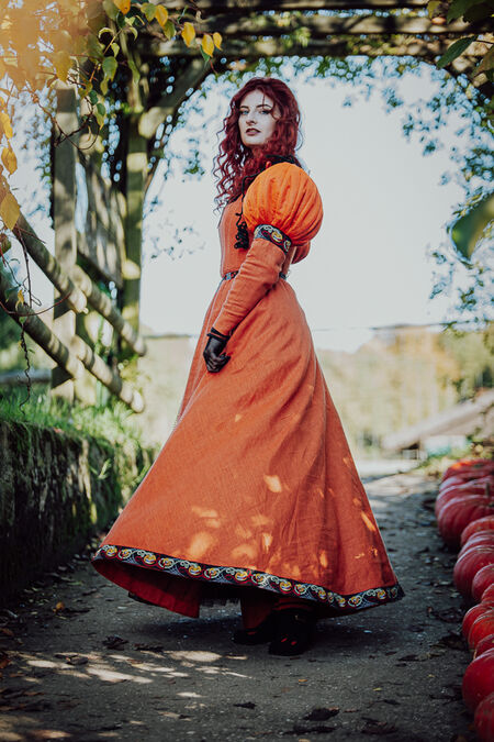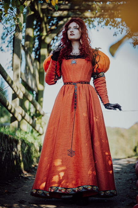 La silhouette générale de la robe s'inspire du patron de la kirtle d'Europe centrale et sera familière à nos clientes grâce à la collection "Rose Allemande" : baleines intérieures en plastique et laçage au dos pour un ajustement optimal, longue jupe ample en lin et bordure citrouille exclusive créée en interne. Les manches et le corsage sont doublés d'une fine toile noire.