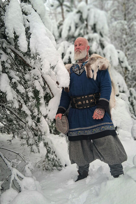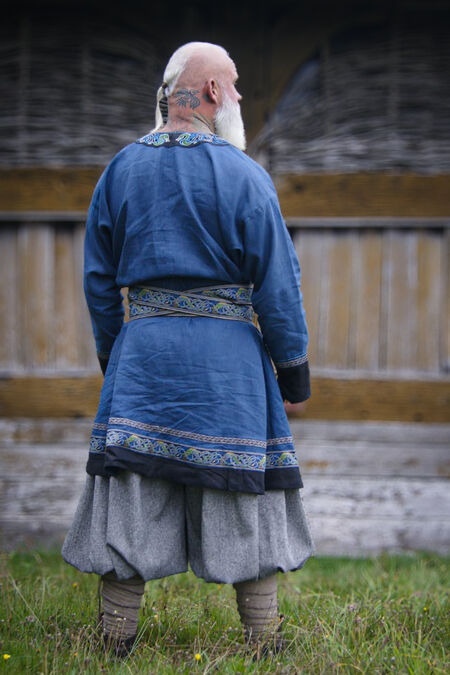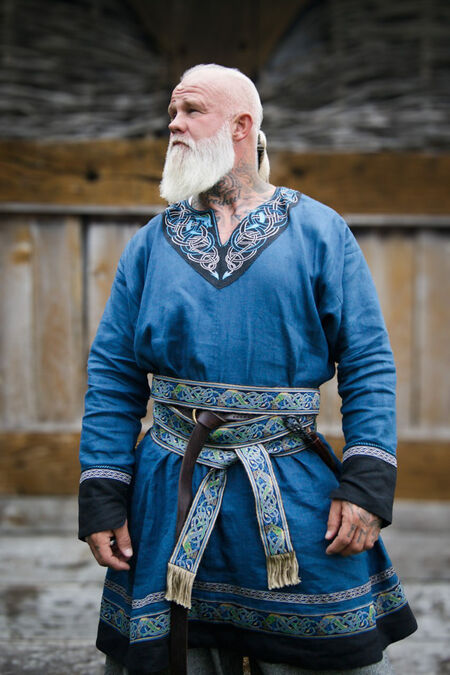 Notre collection « Viking » ne cesse de s’agrandir, avec des vêtements de style plus authentique du début du Moyen Âge. Cette tunique brodée exclusive est confectionnée en lin naturel de haute qualité. Les manches, l’ourlet et l’encolure de la tunique sont ornés de lin contrasté, de passement et de minuscules détails qui, ensemble, créent un chef-d’œuvre textural et visuel multidimensionnel et complexe. Le motif décoratif représente des dragons courants dans les mythes scandinaves. Ce passement unique a été spécialement conçu et fabriqué exclusivement pour notre collection « Viking ». La conception de la tunique est historiquement exacte et est basée sur les découvertes faites lors de fouilles à Birka, en Suède.